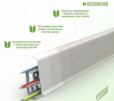 • DECONIKA 70 мм. Многолетний опыт компании-производителя сочетается с использованием экологичных материалов. Форма и перфорация основы плинтуса обеспечивает легкий монтаж. Современный дизайн лицевой части и продуманный задний монтажный профиль обеспечивают приятный внешний вид и простоту в работе. Реалистичные декоры с защитным покрытием значительно продлят эксплуатационный срок.